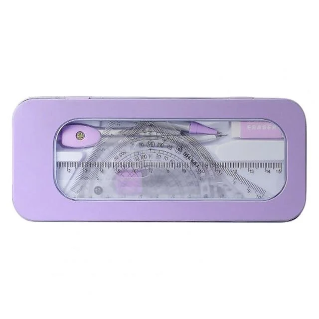 Inside you'll find a range of geometric instruments, such as a compass, ruler, protractor, and set squares, designed to help you ace your math assignments with precision and accuracy. Each tool is crafted from high-quality materials, ensuring durability and long-lasting performance.